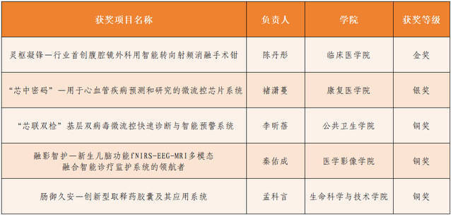 其中临床医学院《灵枢凝锋—行业首创腹腔镜外科用智能转向射频消融手术钳》项目摘得省金;康复医学院《“芯中密码”一用于心血管疾病预测和研究的微流控芯片系统》荣获省银;公共卫生学院《“芯联双检”基层双病毒微流控快速诊断与智能预警系统》、医学影像学院《融影智护—新生儿脑功能fNIRS-EEG-MRI多模态融合智能诊疗监护系统的领航者》、生命科学与技术学院《肠御久安—创新型取释药胶囊及其应用系统》分别获主赛道、产业赛道铜奖。这一成绩是学校深耕创新创业教育的缩影,学校将持续搭建跨学科创新平台,推动更多医学成果从实验室走向临床,在更高赛事舞台书写创新答卷。