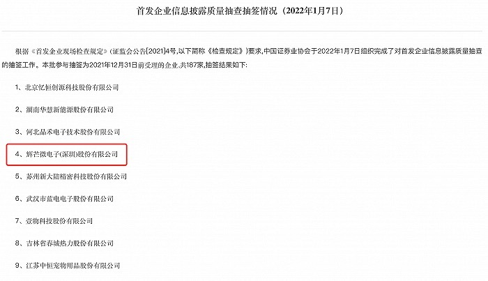 市场认为彼时辉芒微撤回首发申请,与抽中现场检查有关。中国证券业协会于2022年1月7日组织完成了对首发企业信息披露质量抽查的抽签工作,当时共计187家参与抽签,9家抽中券商按月配资,其中就有辉芒微。